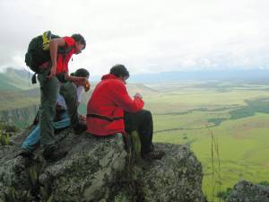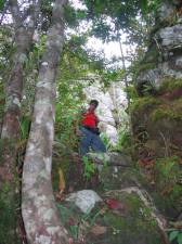 Finalmente, llegamos a la pared de la montaña y la empezamos a subir por un lado, apoyándonos y ayudándonos con las raíces de los árboles y las rocas. ¡Por fín, la cumbre! Nos sentamos en las rocas, al borde del precipicio a contemplar el paisaje tan espectacular y a divisar en la parte de abajo las últimas personas de nuestro grupo. Este era el lugar ideal para una sesión de fotos. Cada quien quería una foto para poder exhibir con orgullo en su "messenger."