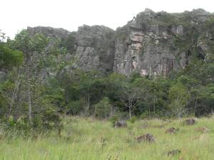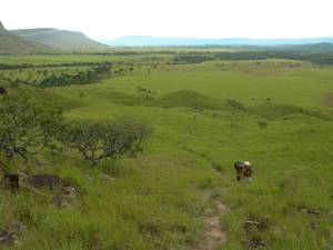 La subida es fuerte. Pero cada vez que uno volteaba hacia atrás, uno se veía recompensado con una vista espectacular. A la izquierda las montañas, a la derecha una selva y al medio la verde sabana con los ríos que ya habíamos cruzado. Los ríos se identifican fácilmente por la hilera de árboles que los rodean.