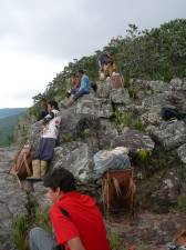 Ya estábamos arriba de este primer "escalón" en el ascenso al Auyantepuy y sólo nos separaban dos kilómetros del campamento Guayaraca. El camino es hermoso. Unas partes en bosque, otras en sabana, con bromelias y flores. Frecuentemente el camino era sobre rocas. Finalmente, llegamos al campamento. Después de cruzar un pequeño riachuelo, llegamos a la churuata donde ya los primeros porteadores habían llegado (¿Cómo hacen para ir tan rápido?) y estaban montando una fogata.