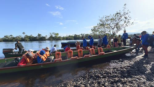 Llegarás al embarcadero con vista hacia los tepuyes y al tope de los saltos de agua, para embarcarte en una curiara (embarcación indígene alargada)