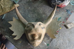 11. Empapelado: Cubrimos con capas de papel los cachos y las orejas de forma que queden unidas a nuestra máscara cuidando el acabado (la finalidad es cubrir la unión de los cachos y orejas en la máscara)
